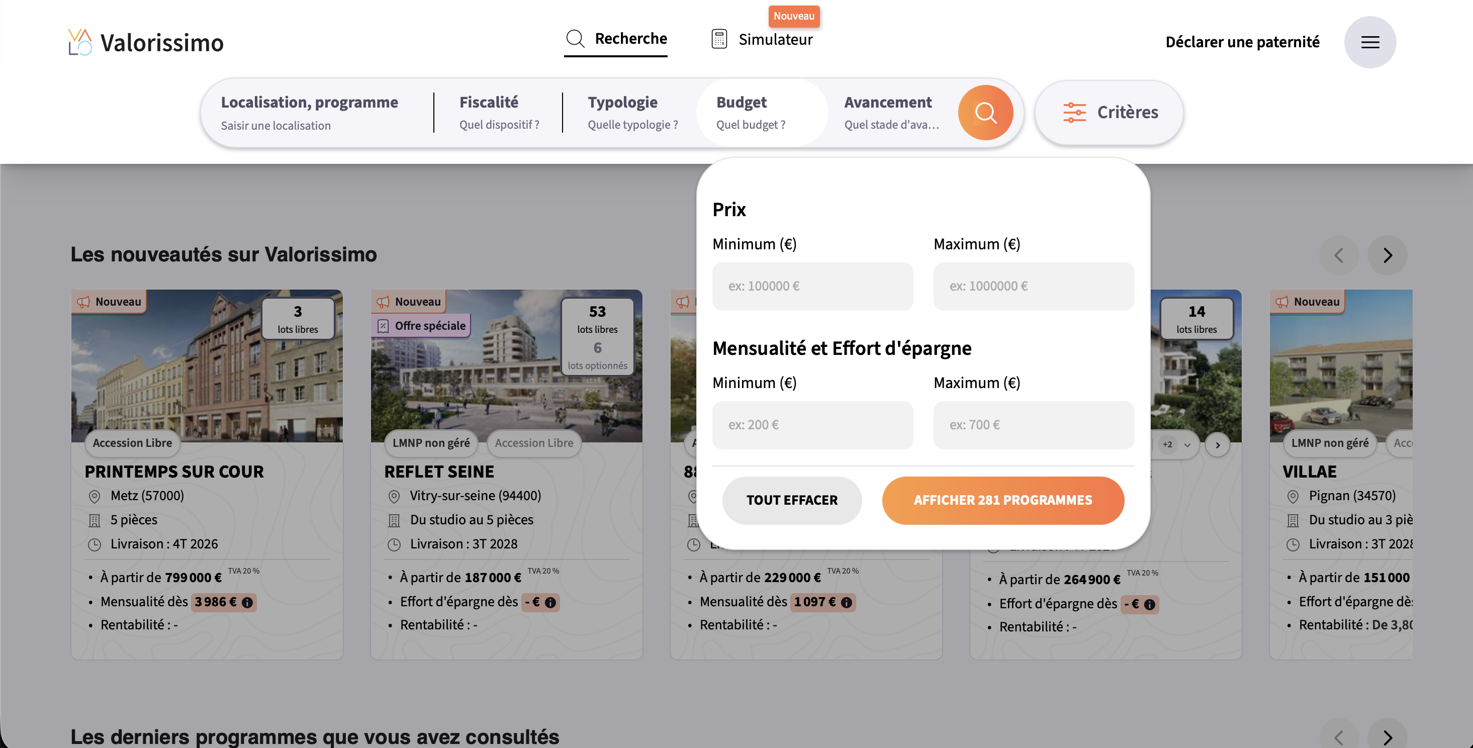 La plateforme affiche automatiquement les lots compatibles avec ces critères, en résidence principale comme en investissement.